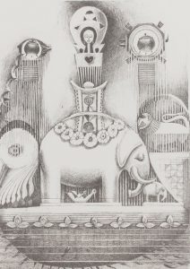 In an interview with The Art Newspaper (September 2020), contemporary artist Sanford Biggers, described his late-cousin John Biggers’ work as Afro-futurism and said, “John’s work often incorporated Euclidean shapes and patterns that he had encountered in Ghana in the 1950s. He was mostly depicting the Jim Crow South and the southern experience of African Americans, but in Ghana he became entranced by these traditional patterns, which got him interested in sacred geometry as a means to chronicle history.”